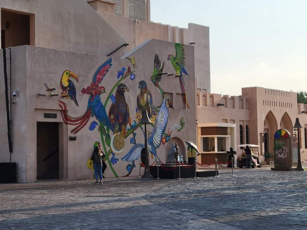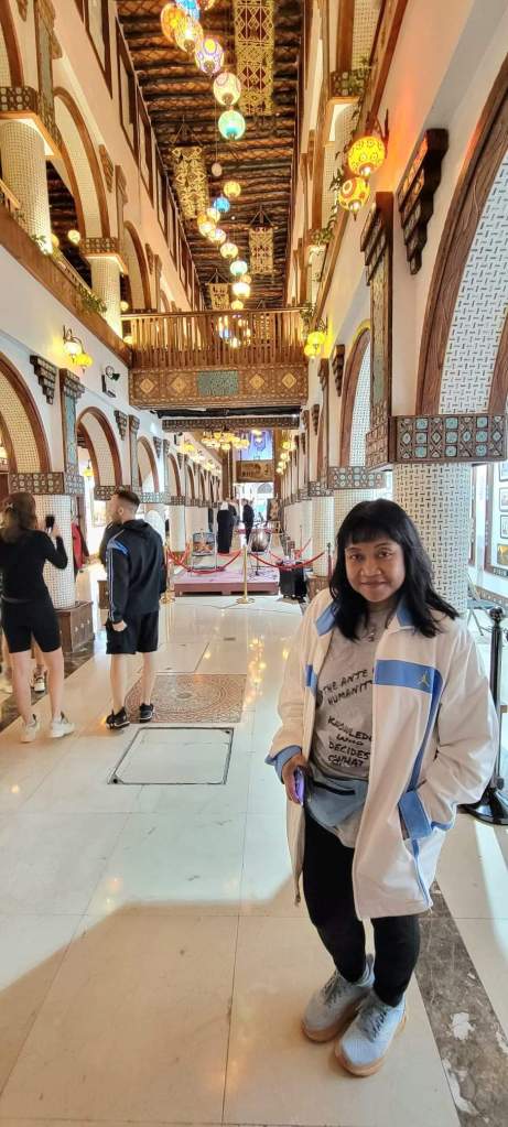 After about 10-15 minutes at the mosque, we walked back to Souq Waqif where we visited the Souq Waqif Art Center. The art center was designed with beautiful intricacies all around. On display were Qatari cultural artifacts including traditional colorful lamps and musical instruments, pottery, carvings, as well as portraits, and paintings including those that feature the Qatari ruling royal family members, and World Cup 2022 commemorative items. It provided the souq’s visitors with something else to do other than just shopping and eating while providing glimpses into Qatari culture and creativity.