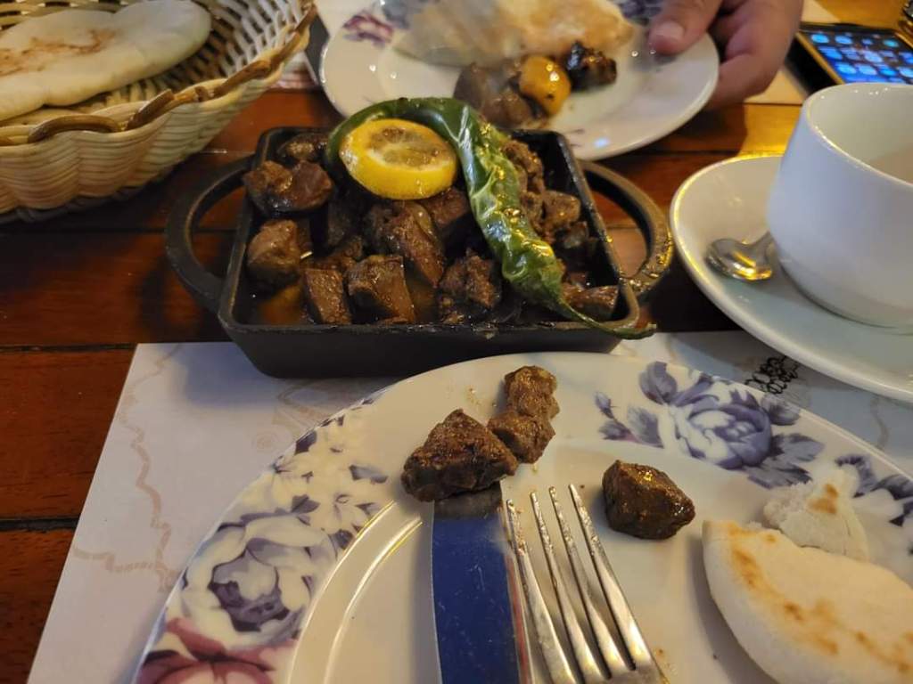 The night-time experience at Souq Waqif was a lot more vibrant and lively compared to our daytime visit, although it felt overwhelmingly crowded at some points too. We ended our experience there with a delicious dinner at a Syrian restaurant. We especially enjoyed the hot and fresh pita (Arab flatbread), and dome-shaped grilled kibbeh (bulgur pastry) filled with minced meat, nuts, and pomegranate. We shared the dishes we ordered including the lamb liver appetizer and the mixed grilled meats main dish.
