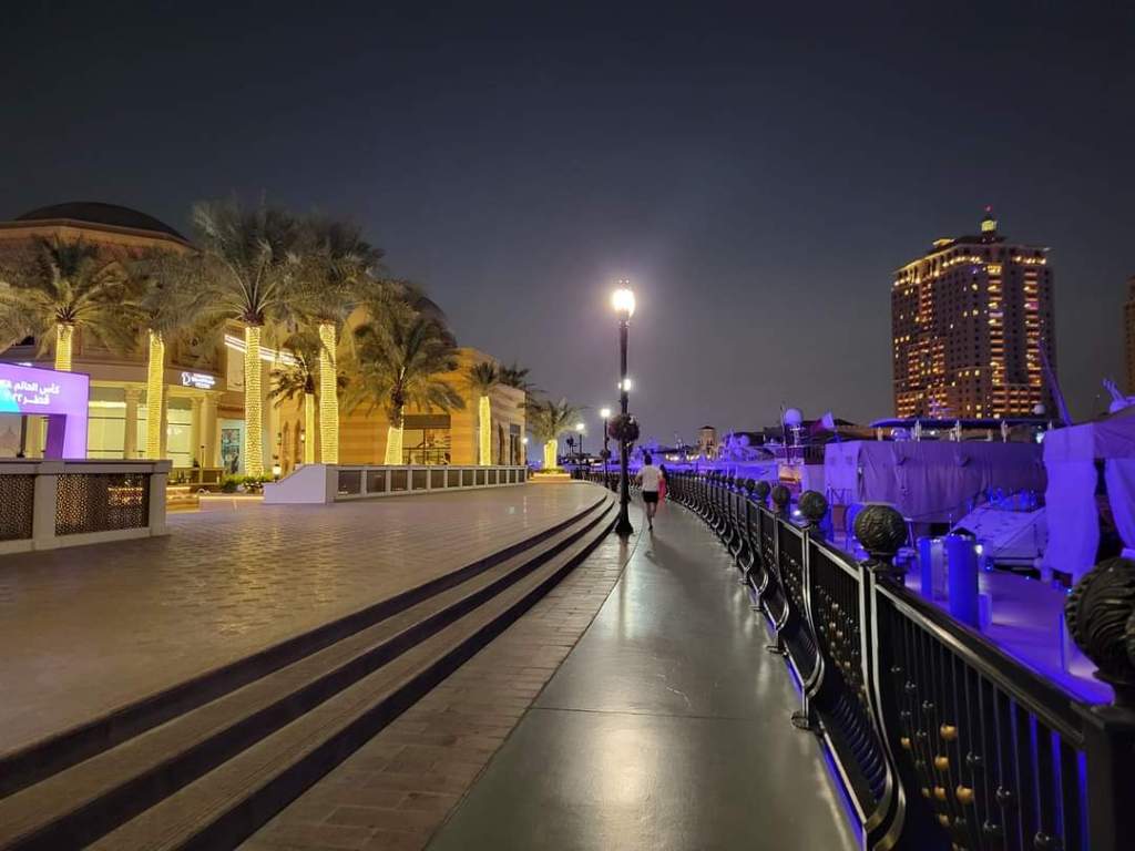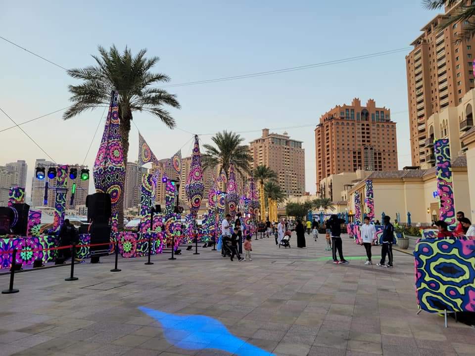 Upbeat music echoing through the entrance area welcomed us upon arriving at The Pearl a little after 4 pm. The visual feast of elegant boats and yachts on serene waters, grand Qatari traditional-style buildings against the background of majestic taller ones, palm trees with trunks draped in lights, eye-catching bright-colored African-art structures, and charming alfresco cafes got visitors like us excited to explore the marina. Beautiful changing lights all around added a magical element to the area as night falls. Buildings, trees, waters, yachts, and decorative structures were all illuminated in pleasing shades of purple, blue, green, pink, red, and yellow. At night time, colorful musical fountains started dancing to lively music across the canal too.