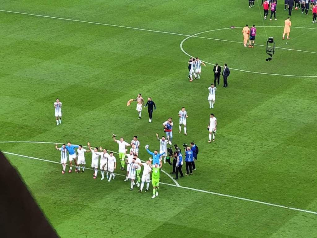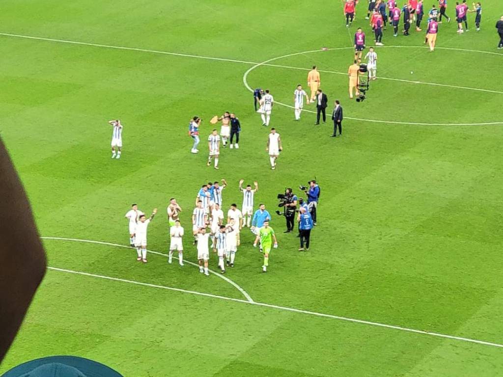 We were delighted to get to see Argentina’s goalkeeper, Emiliano “Dibu” Martinez engaged in warm-up exercises and light practice activities at the goal on our side. Later, we got great views of both the Argentinian and Croatian teams warming up in the field. It was surreal, to say the least. I was not such an ardent fan of football/soccer in my younger days and never thought I would feel so fortunate to get to indulge in such a treat. Argentina’s fans were still the majority at the stadium and their continuous cheers and team anthems echoed resoundingly throughout the game.